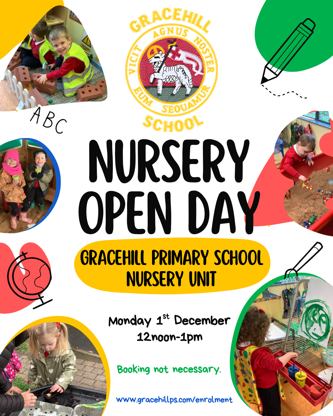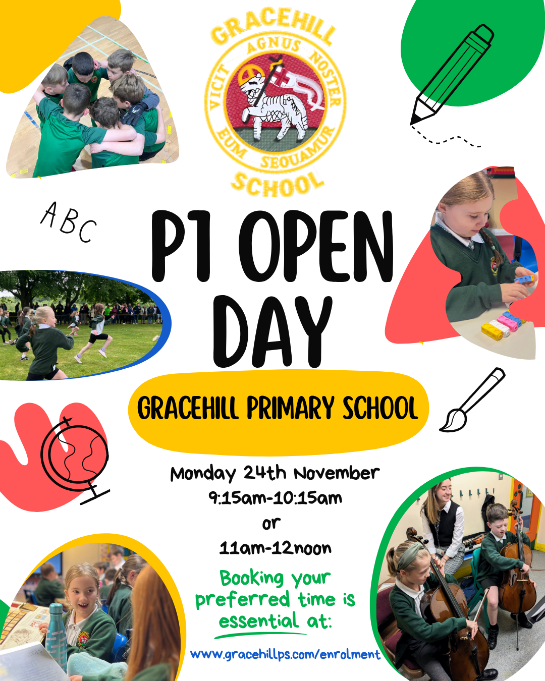 We’re excited to invite you to our P1 Open Day at Gracehill Primary on Monday 24th November at 9:15 and 11am.