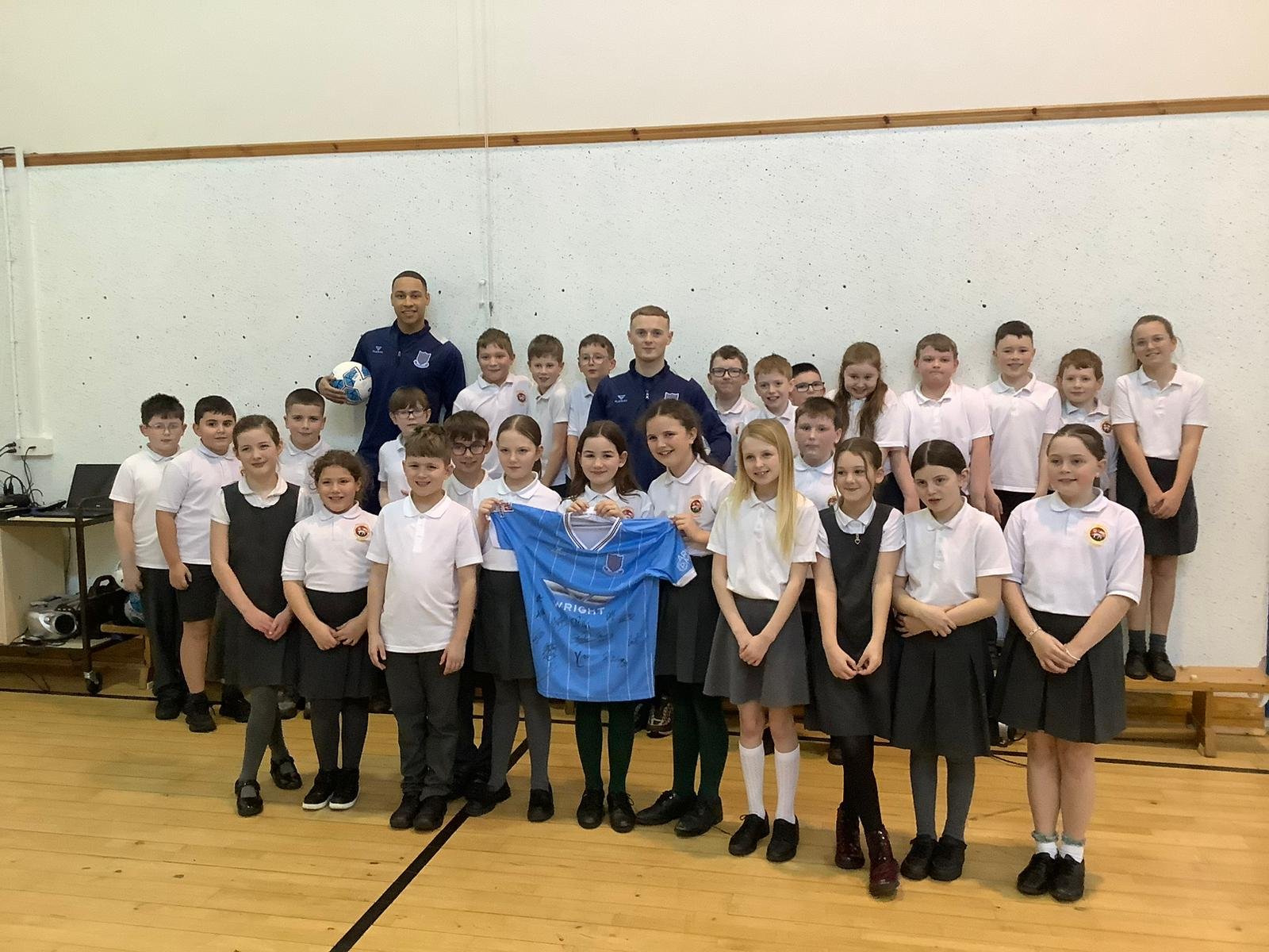 This week P6 got to meet players David Toure and Ali Gould and coach Glenn Wilkinson from the Ballymena United football team. The boys and girls took part in a short training session and enjoyed learning new skills and taking part in team games. They were delighted to be presented with a signed Ballymena United shirt. Thank you Sky Blues 🩵